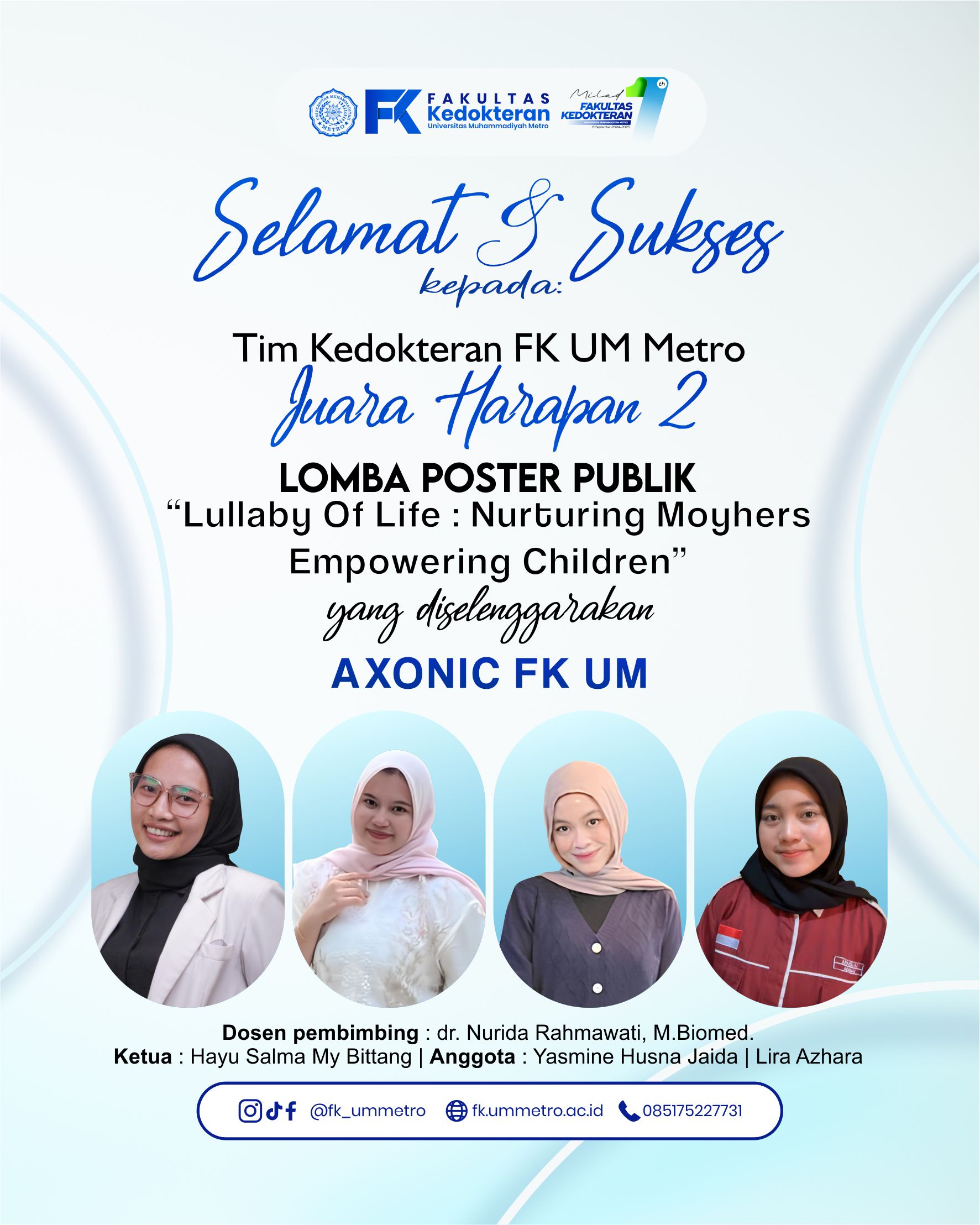 Lomba Poster Publik AXONIC kali ini mengangkat tema yang kompetitif, dan tim FK UM Metro berpartisipasi dengan karya poster berjudul "Lullaby Of Life: Nurturing Mothers Empowering Children".