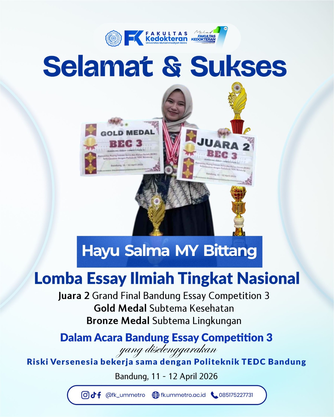 “Kami sangat mengapresiasi atas capaian ananda Hayu Salma. Hal ini membuktikan bahwa mahasiswa FK UM Metro memiliki daya saing tinggi dan pemikiran yang visioner. Kami selalu mendorong mahasiswa untuk tidak hanya unggul di ruang kelas, tetapi juga mampu menjawab tantangan riil masyarakat melalui riset dan inovasi,” ungkap dr. Windi.
