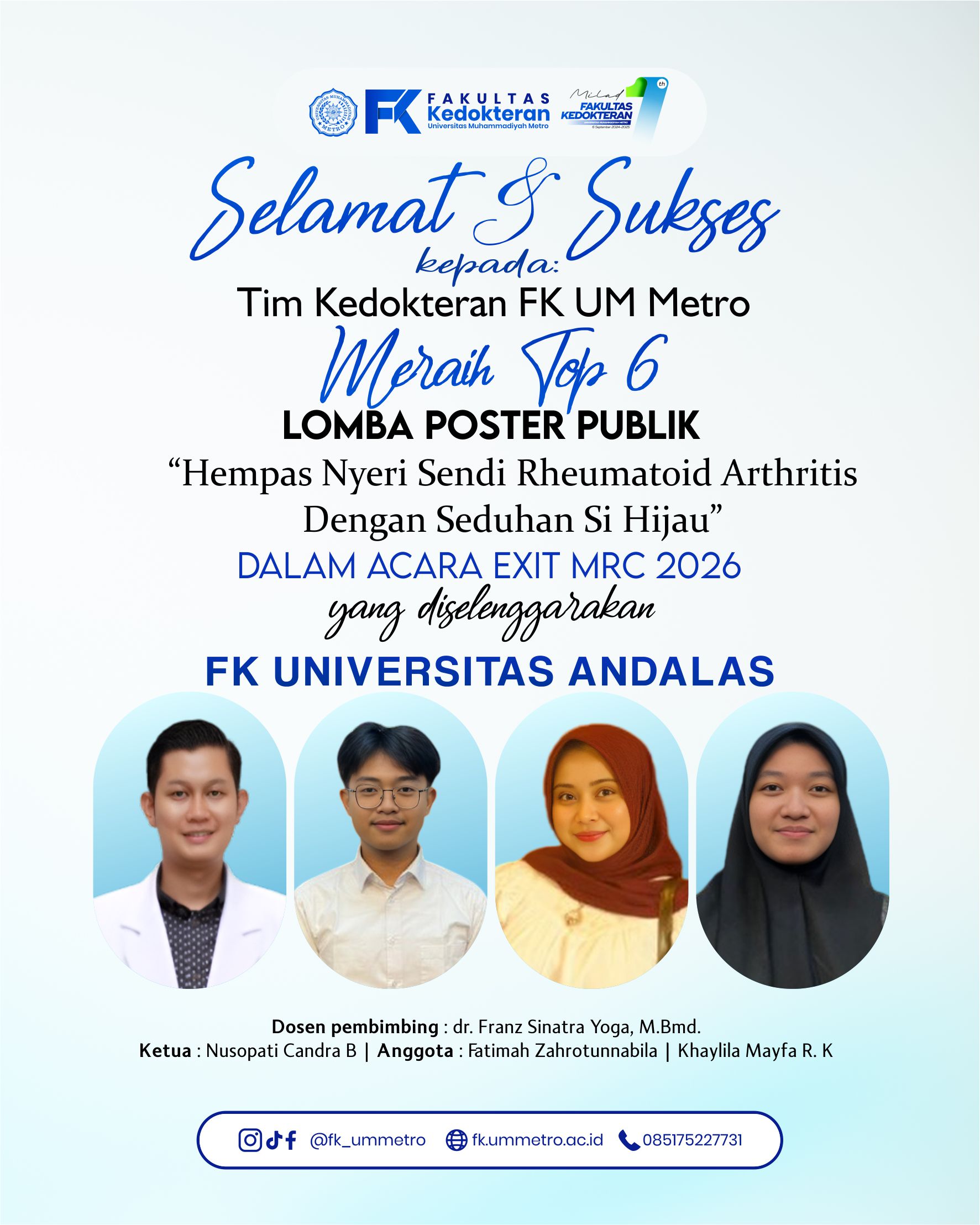 "Jujur, tantangan terberat adalah bagaimana membuat poster yang secara visual menarik tapi tetap akurat secara medis. Kami ingin 'Si Hijau' ini tidak hanya jadi juara di atas kertas, tapi benar-benar bisa jadi literasi bagi mereka yang menderita nyeri sendi. Kemenangan ini kami persembahkan untuk almamater tercinta, FK UM Metro, yang selalu mendukung langkah kami hingga ke Padang," ungkap Nusopati.