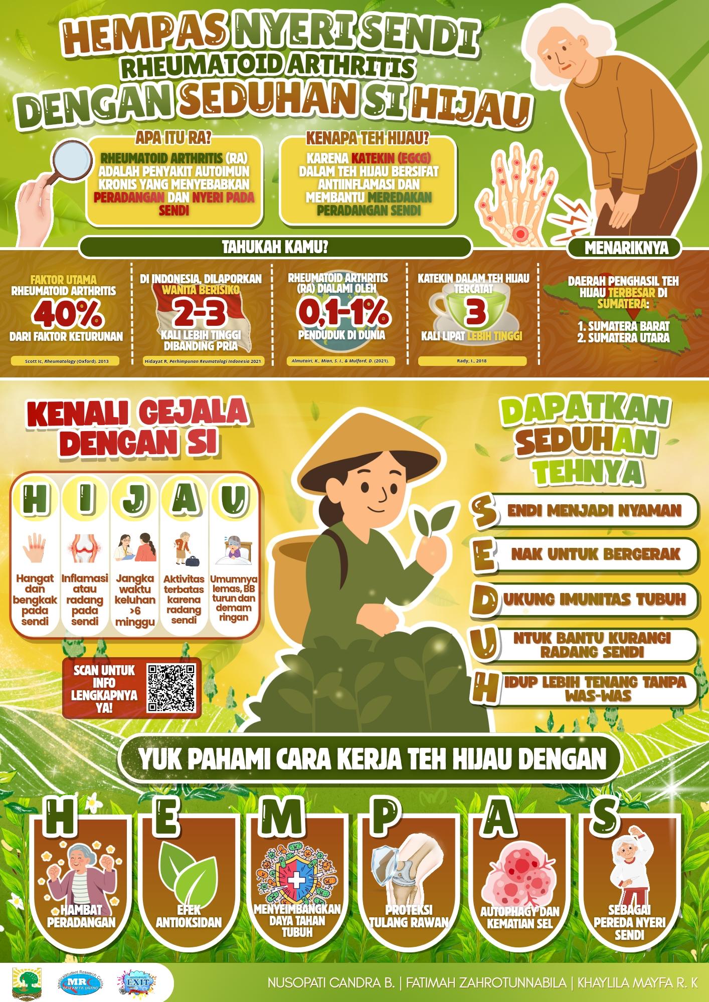 Topik ini dipilih karena relevansinya yang tinggi dengan masalah kesehatan di masyarakat. Rheumatoid Arthritis atau radang sendi kronis seringkali menjadi momok, terutama bagi lansia. Lewat poster tersebut, mereka mengedukasi masyarakat mengenai potensi tanaman herbal yang mereka sebut sebagai "Si Hijau" sebagai alternatif terapi alami yang memiliki basis ilmiah kuat untuk meredakan nyeri sendi.